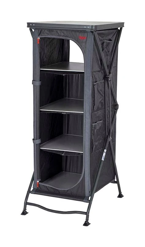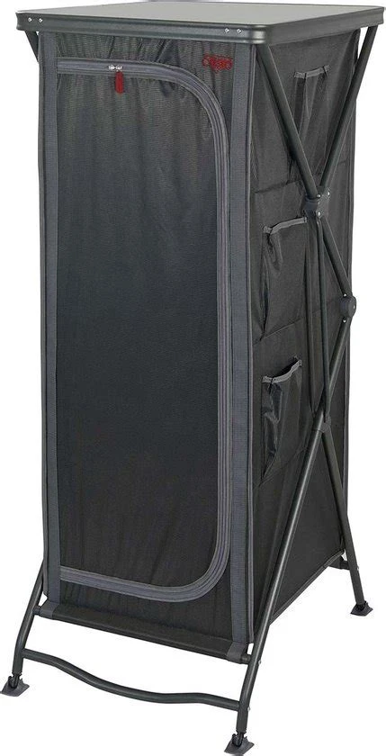 Een zeer stabiele en extra hoge leg/hangkast. Zeer eenvoudig op te zetten door een uniek systeem voor het in- en uitklappen van deze kast! Deze legkast beschikt over een grijs melamine hittebestendig en watervast oplegblad en een aluminium frame/beschermrand. De hoes is gemaakt van extra stevig 400 denier polyester met daarin 4 handige legplanken, aan de zijkant 4 vakken en een mesh raam aan de achterkant. De verstelbare poten zijn afzonderlijk af te stellen. De kast beschikt over speciale stabilisator voetjes zodat de legkast op iedere ondergrond stabiel staat. Inclusief kledingstang om van de legkast een hangkast te maken. De kast wordt geleverd in een draagtas.