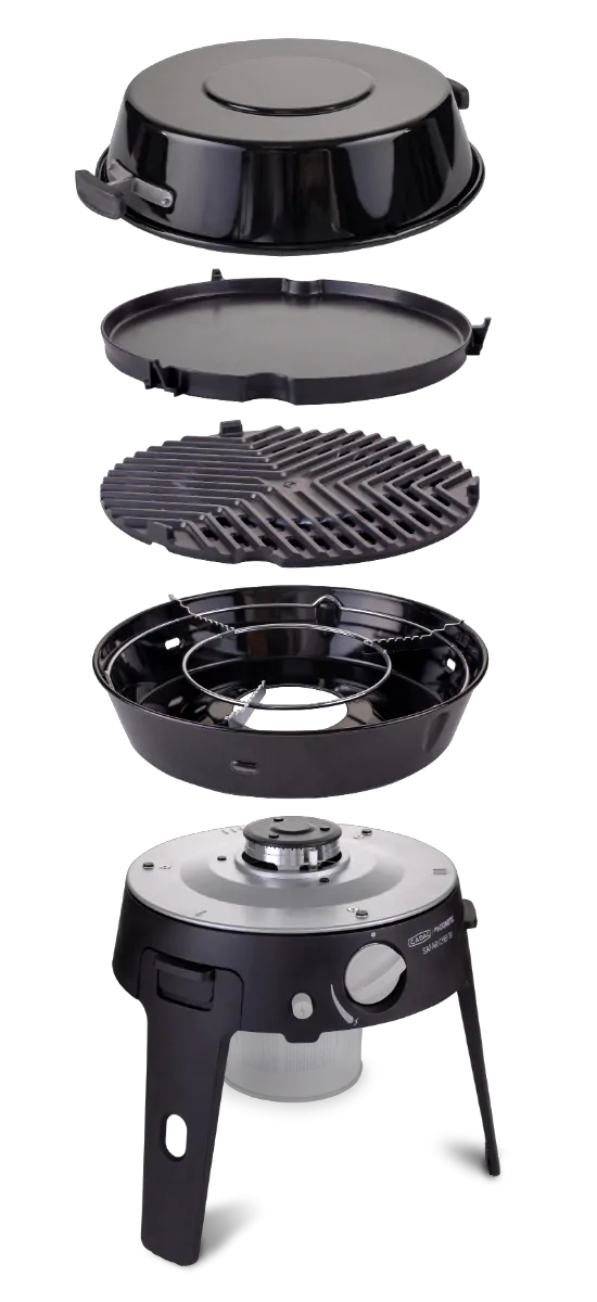 Incl. pandrager, BBQ rooster, bakplaat en pan/deksel