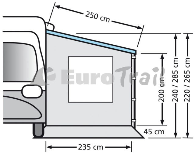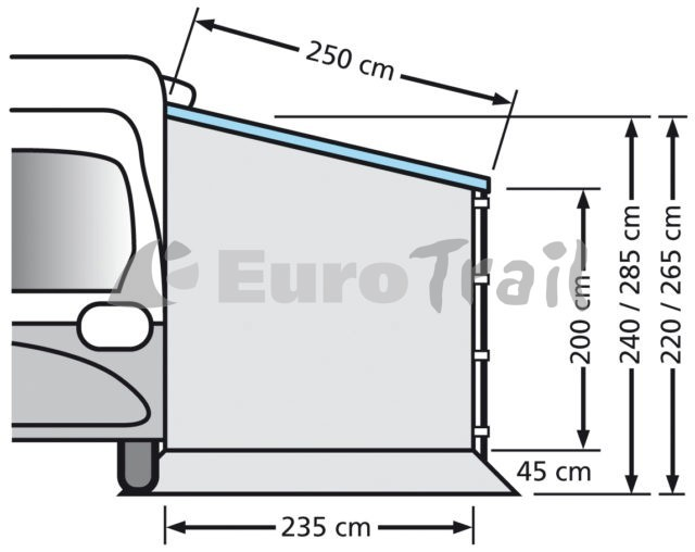 235×200/240 : Uitval 250cm, Onderkant luifel 240-280cm